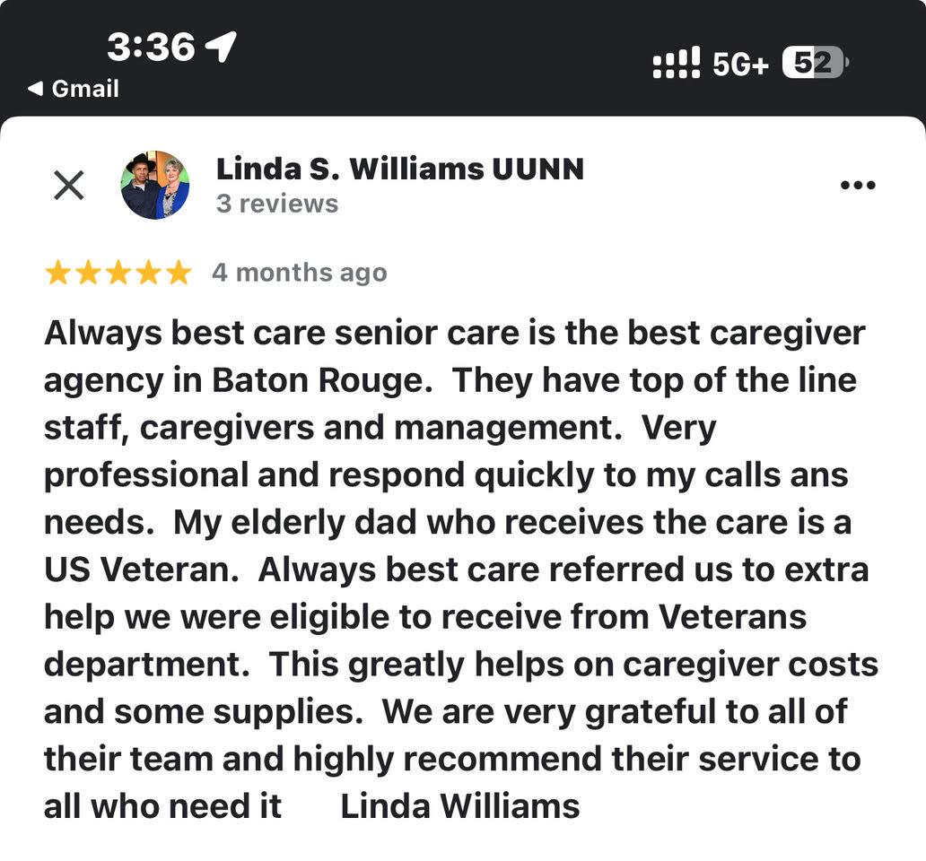 For more than 15 years, Always Best Care Senior Services has been a trusted name in home care in Baton Rouge and the surrounding areas. As a locally owned and operated home care agency, we specialize in providing compassionate, professional senior care services that help older adults remain safe, comfortable, and independent in their own homes.